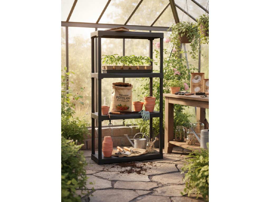 A műanyag konstrukció könnyű, könnyen tisztítható, és nem szívja magába a szagokat vagy a nedvességet. Tökéletes kamrákba, pincékbe és garázsokba.
