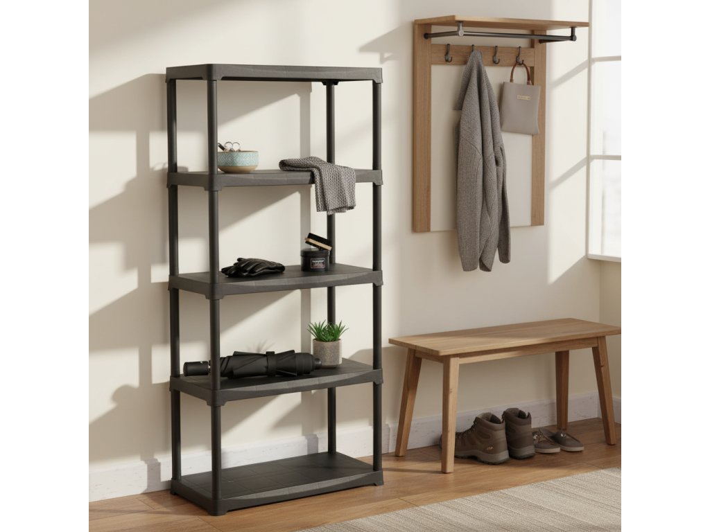A fekete műanyag polc erős, stabil és tágas. Nagyobb szélességének és mélységének köszönhetően elegendő helyet kínál még a nagyobb tárgyaknak is. Az összeszerelés gyors, a tartós műanyagnak köszönhetően a polc könnyen tisztítható és évekig kitart.