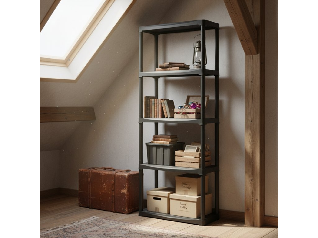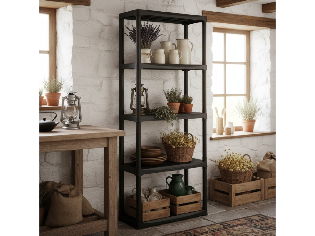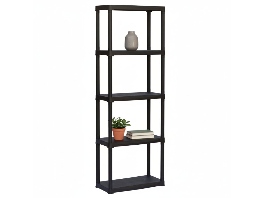 A fekete polc strapabíró műanyagból készült, amely ellenáll a nedvességnek, a hidegnek és a vegyszereknek. Az okos kattintásos rendszernek köszönhetően néhány perc alatt összeszerelhető, és a maximális stabilitás érdekében a falhoz rögzíthető.