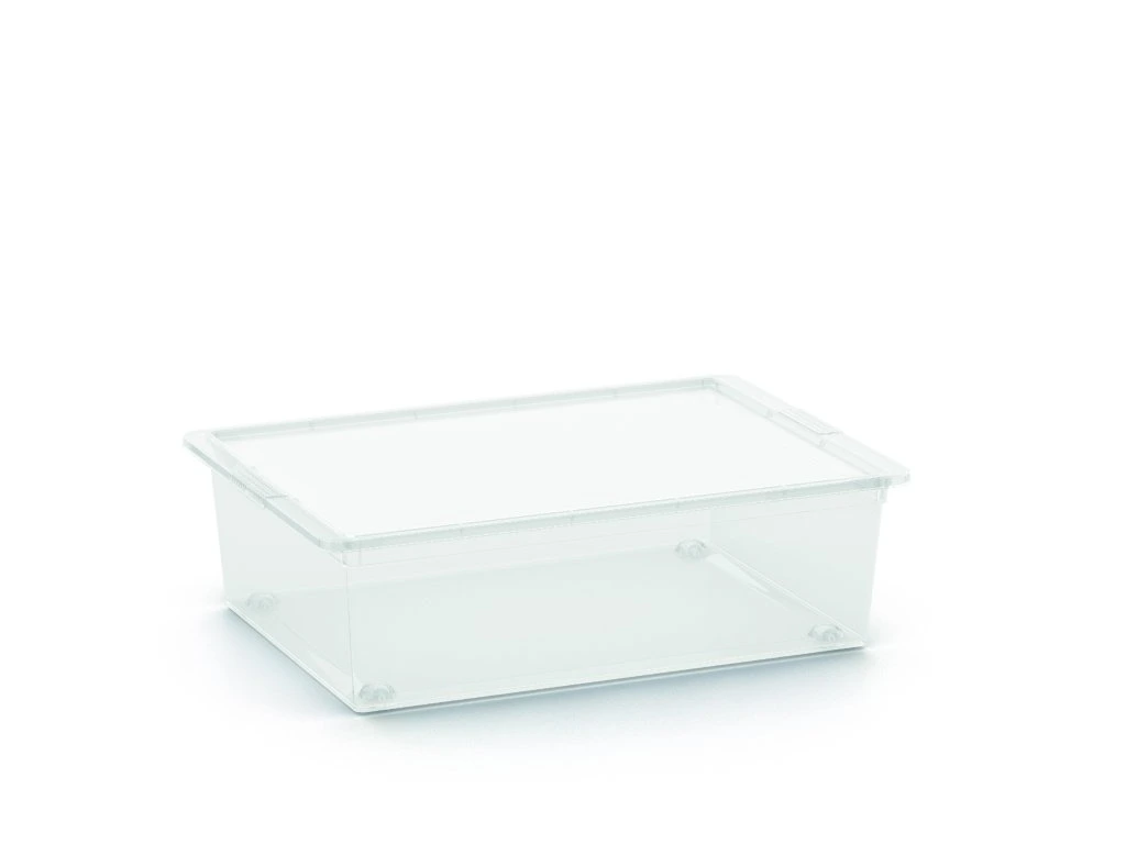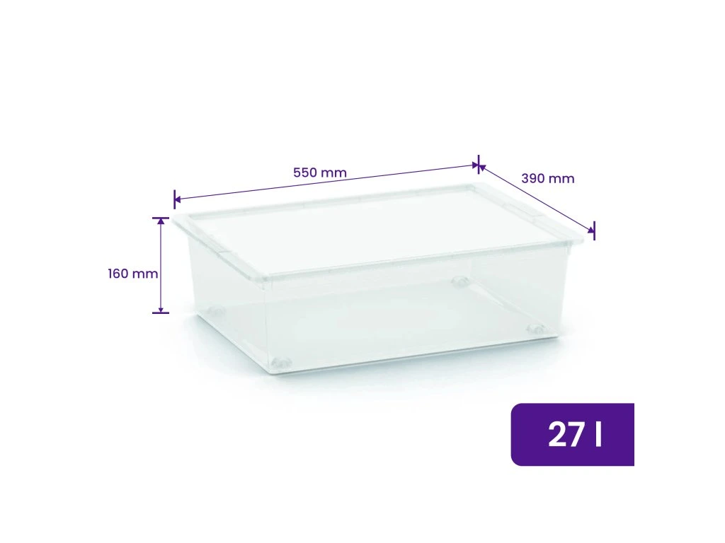 A HOME L, 27 l-es műanyag doboz univerzális segítő ruhák, kiegészítők, játékok, dokumentumok vagy szezonális cikkek rendezett tárolására. 55 x 39 x 16 cm -es méreteinek köszönhetően elegendő helyet biztosít nagyobb mennyiségű holmi számára, ugyanakkor alacsony profiljának köszönhetően könnyen elfér szekrényekben, polcokon vagy az ágy alatt. Az átlátszó kialakításnak köszönhetően mindig átláthatja a tárolt tartalmat, míg a masszív fedél védelmet nyújt a por és a nedvesség ellen.